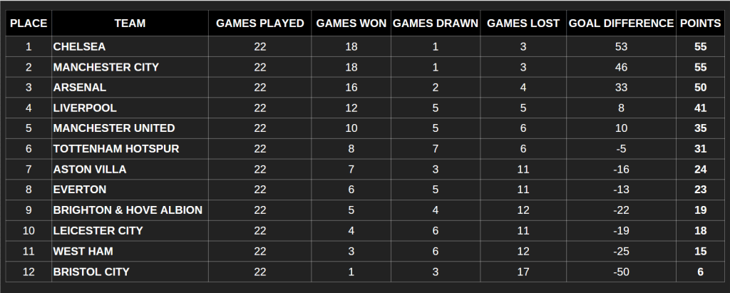 Bristol City have taken up the 12th spot on the table all season having only picked up one victory and three draws the lowest of any team.